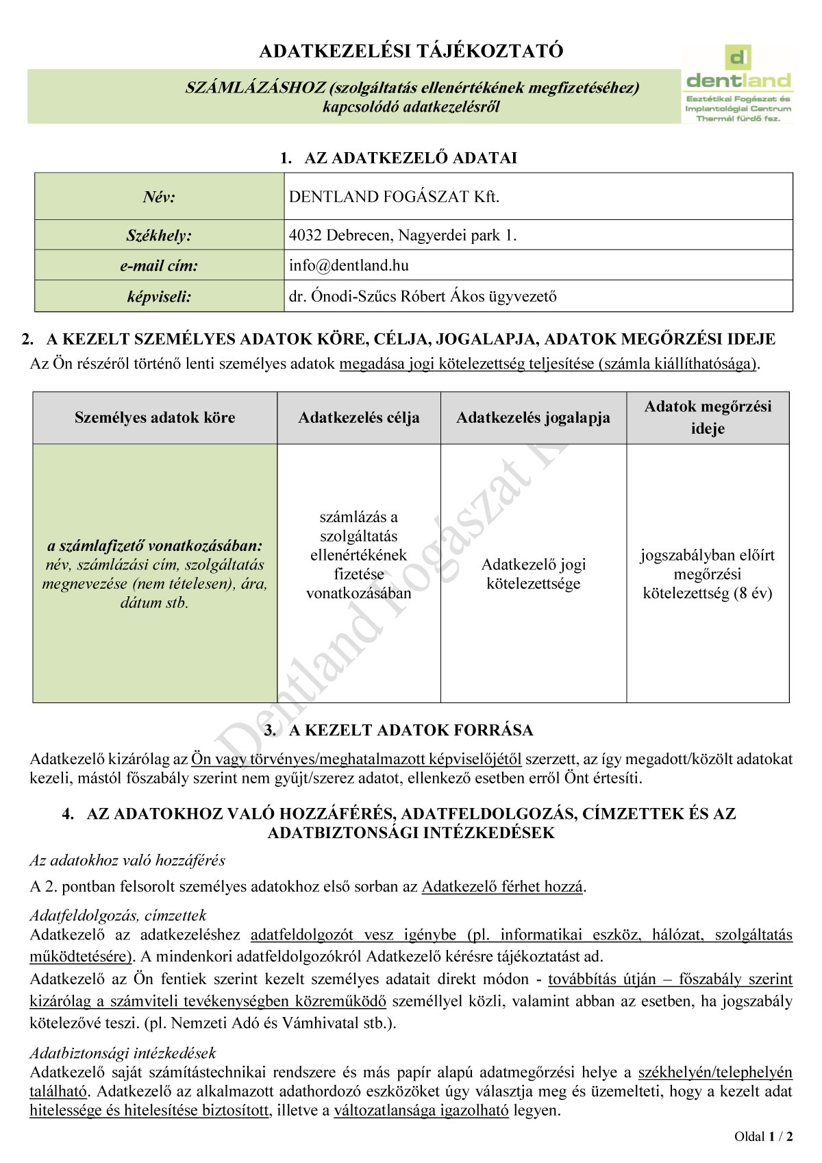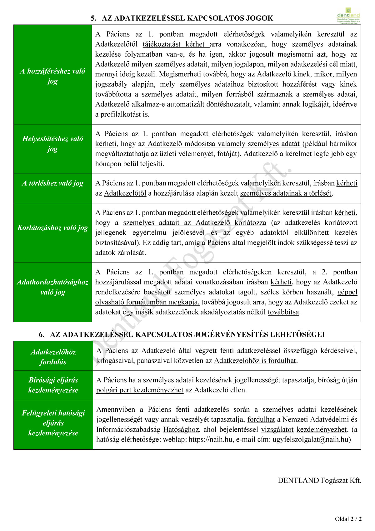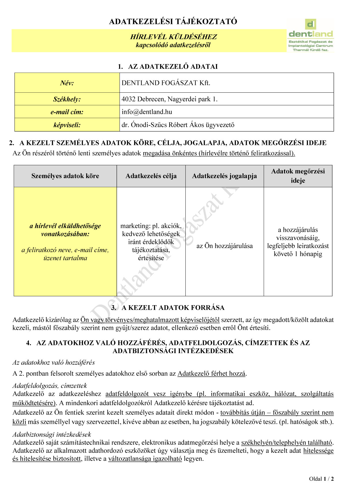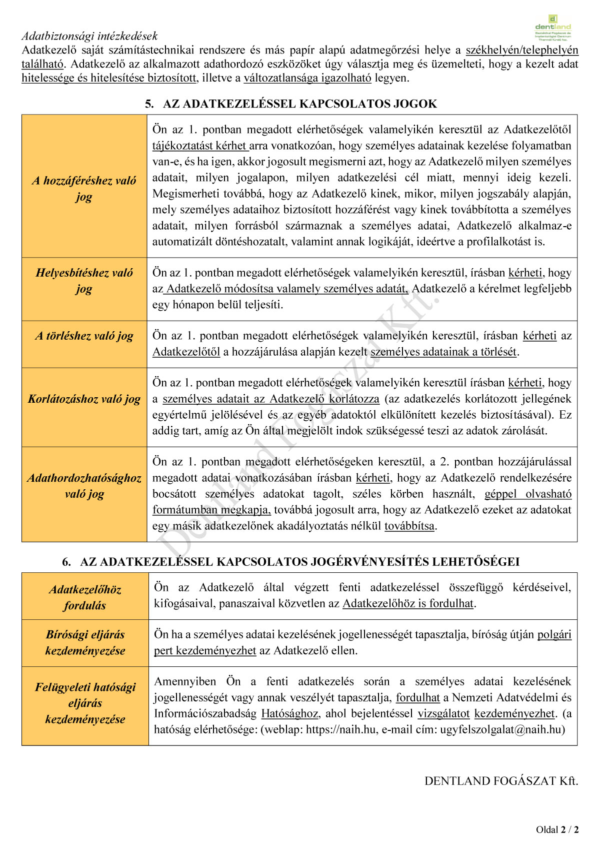 Home / Dentland Fogászat Kft. – GDPR Dentland Fogászat Kft. – GDPR Dentland Fogászat Kft. - Adatkezelési tájékoztatás A képekre vagy a letöltés gombokra kattintva letölthető az adott „Adatkezelési tájékoztató” Adatkezelési tájékoztatás Fogászati ellátás letöltés Adatkezelési tájékoztatás Telemedicina letöltés Adatkezelési tájékoztatás Elektronikus üzenet megválaszolásához letöltés Adatkezelési tájékoztatás Hírlevél küldéséhez letöltés Adatkezelési tájékoztatás Panaszkezelés letöltés Adatkezelési tájékoztatás Érintetti jogok gyakorlásához letöltés Adatkezelési tájékoztatás Kamera üzemeltetése letöltés Adatkezelési tájékoztatás Szolgáltatási díj megfizetéséhez letöltés Adatkezelési tájékoztatás - Fogászati ellátás Adatkezelési tájékoztatás - Telemedicina Adatkezelési tájékoztatás - Elektronikus üzenet megválaszolásához Adatkezelési tájékoztatás - Hírlevél küldéséhez Adatkezelési tájékoztatás - Panaszkezeléshez Adatkezelési tájékoztatás - Érintetti jogok gyakorlásához Adatkezelési tájékoztatás - Kamera üzemeltetéshez Adatkezelési tájékoztatás - Szolgáltatási díj megfizetéséhez